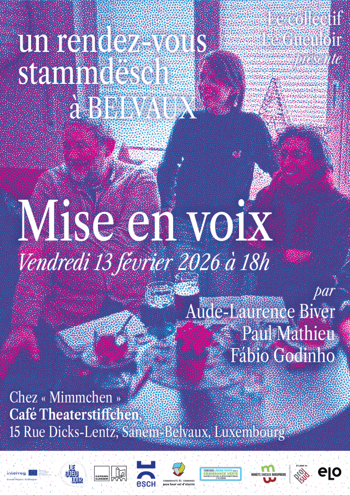 Paul MATHIEU, avec le collectif Le Gueuloir, présente trois petites pièces le vendredi 13 février à 18h à Belvaux (Grand-Duché).