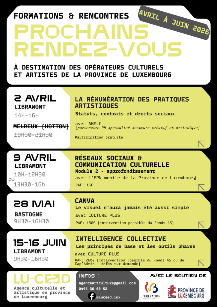 L’AGENCE CULTURELLE ET ARTISTIQUE EN PROVINCE DE LUXEMBOURG organise une formation sur la rémunération des pratiques artistiques à Libramont le jeudi 2 avril 2026.