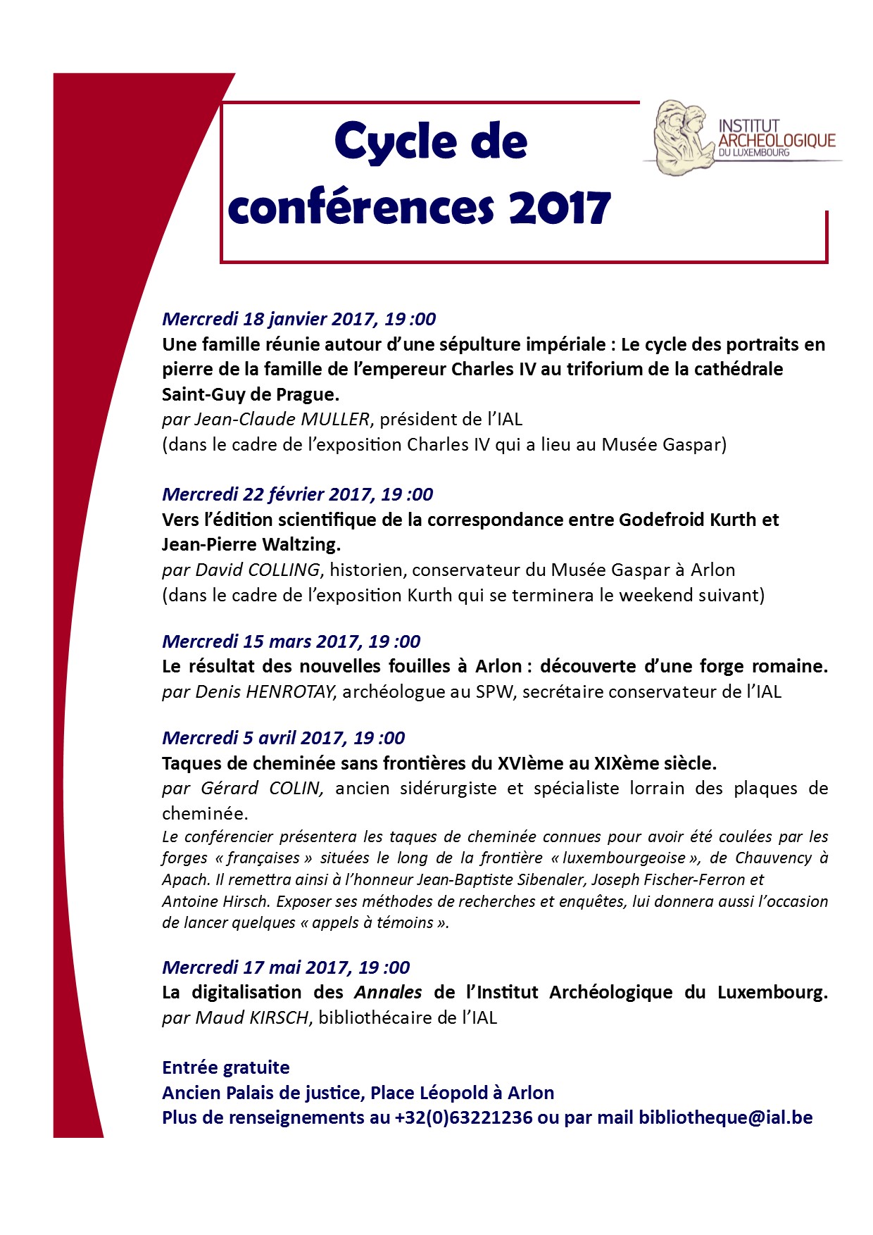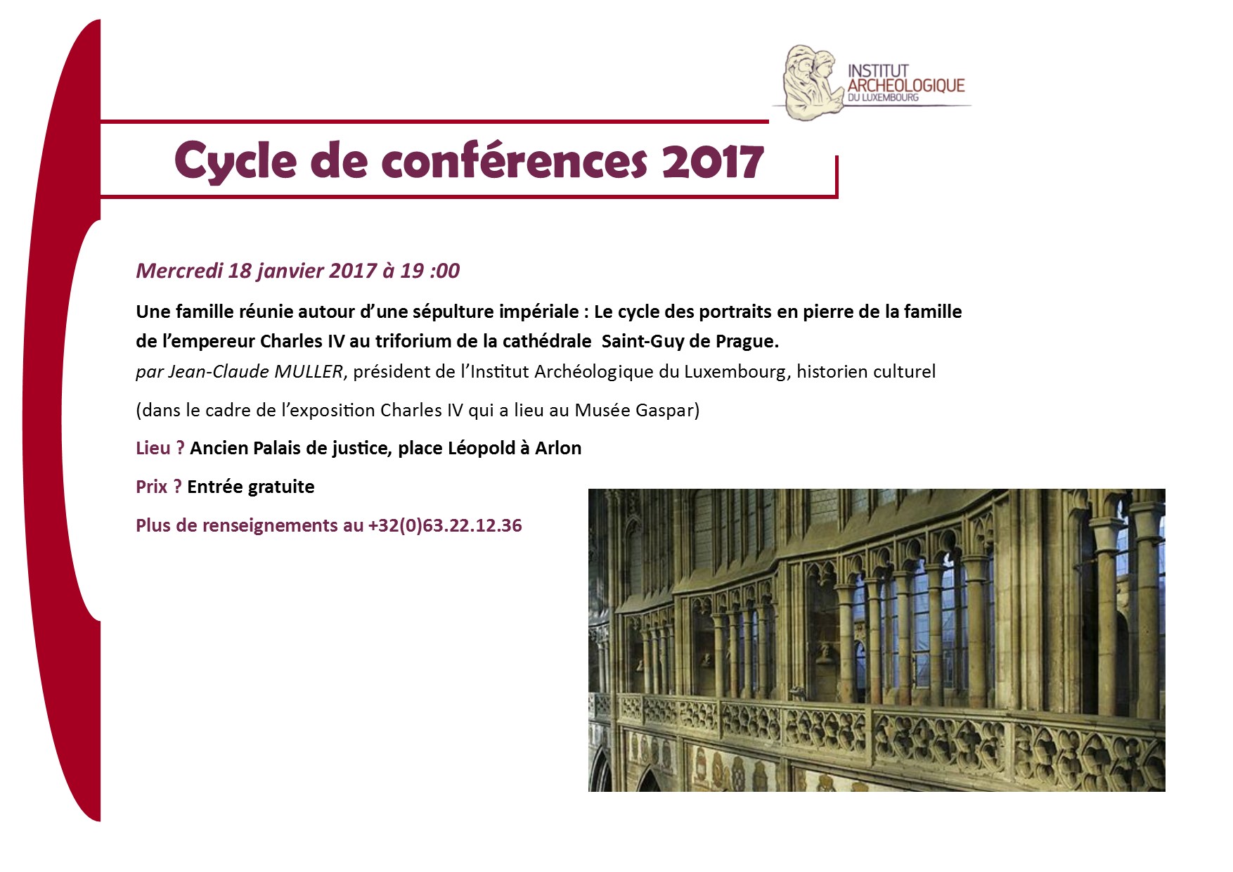 N’oubliez pas ce mercredi 18 janvier à 19h à l’ancien palais de justice à Arlon, la première conférence de l’année donnée par Jean-Claude Muller, président de l’IAL : « Une famille réunie autour d’une sépulture impériale : Le cycle des portraits en pierre de la famille de l’empereur Charles IV au triforium de la cathédrale Saint-Guy de Prague. » L’entrée est gratuite.