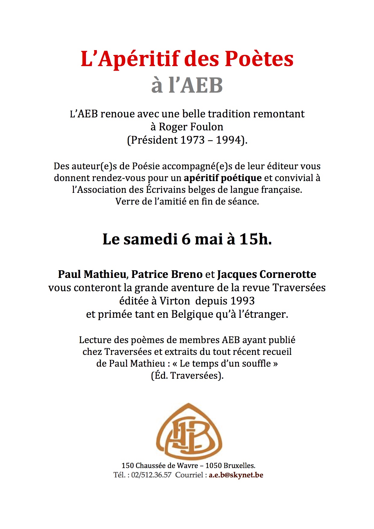 A la Maison de l’Association des Ecrivains belges à Bruxelles aura lieu le samedi 6 mai à 15h l’apéritif des poètes.