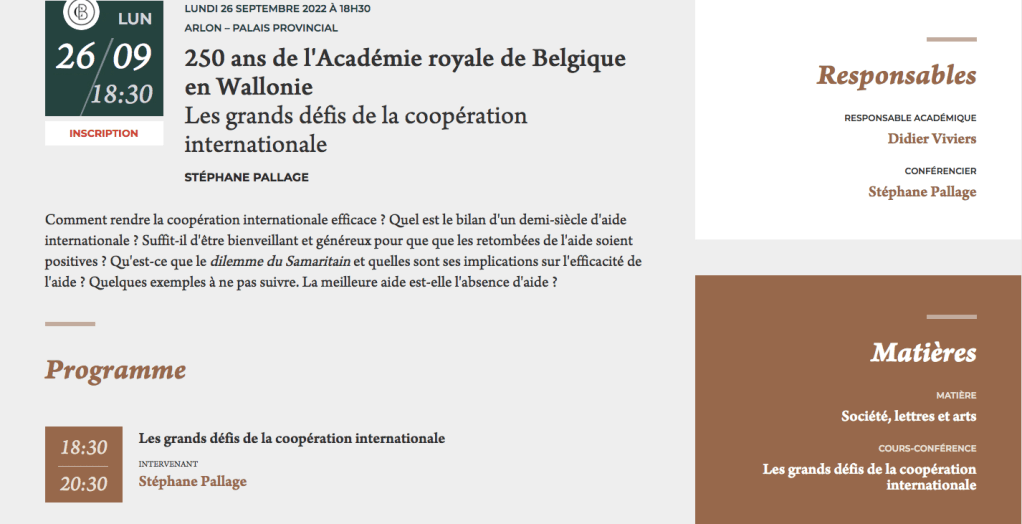 Conférence organisée par l’Académie royale de Belgique, au Palais provincial, le lundi 26 septembre à 18.30h, sur Les grands défis de la coopération internationale, par Stéphane PALAGE.