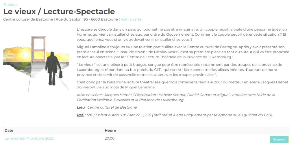 Lecture-spectacle « Le vieux », de Miguel LAMOLINE, mis en scène par Jacques HERBET, au Centre Culturel de Bastogne le vendredi 14 octobre à 20h.
